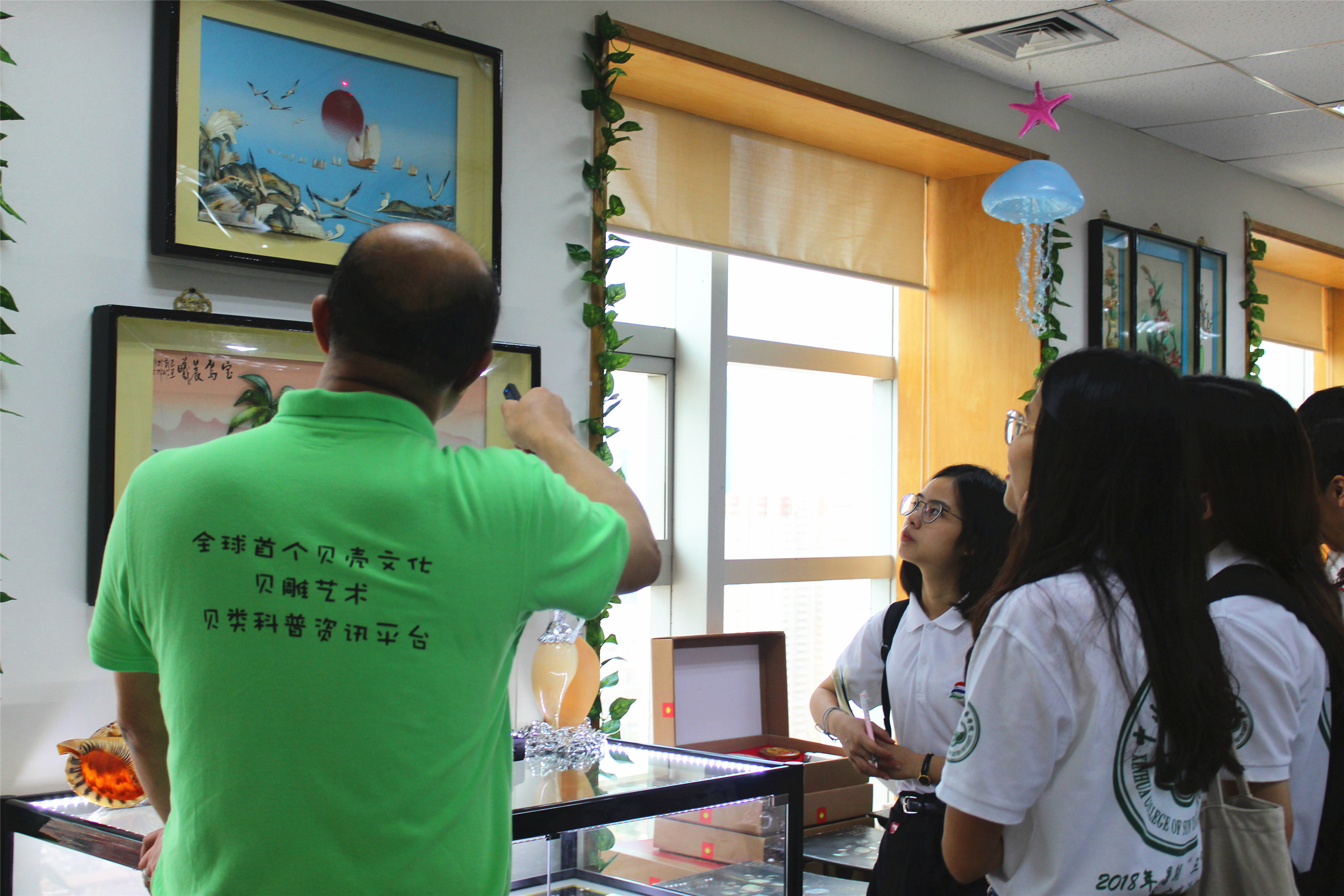 在講解貝殼科普知識的過程中,貝殼紅翁戎先生全程在旁關注、引導,并補充一些貝殼的應用、貝雕藝術的創(chuàng)作知識。