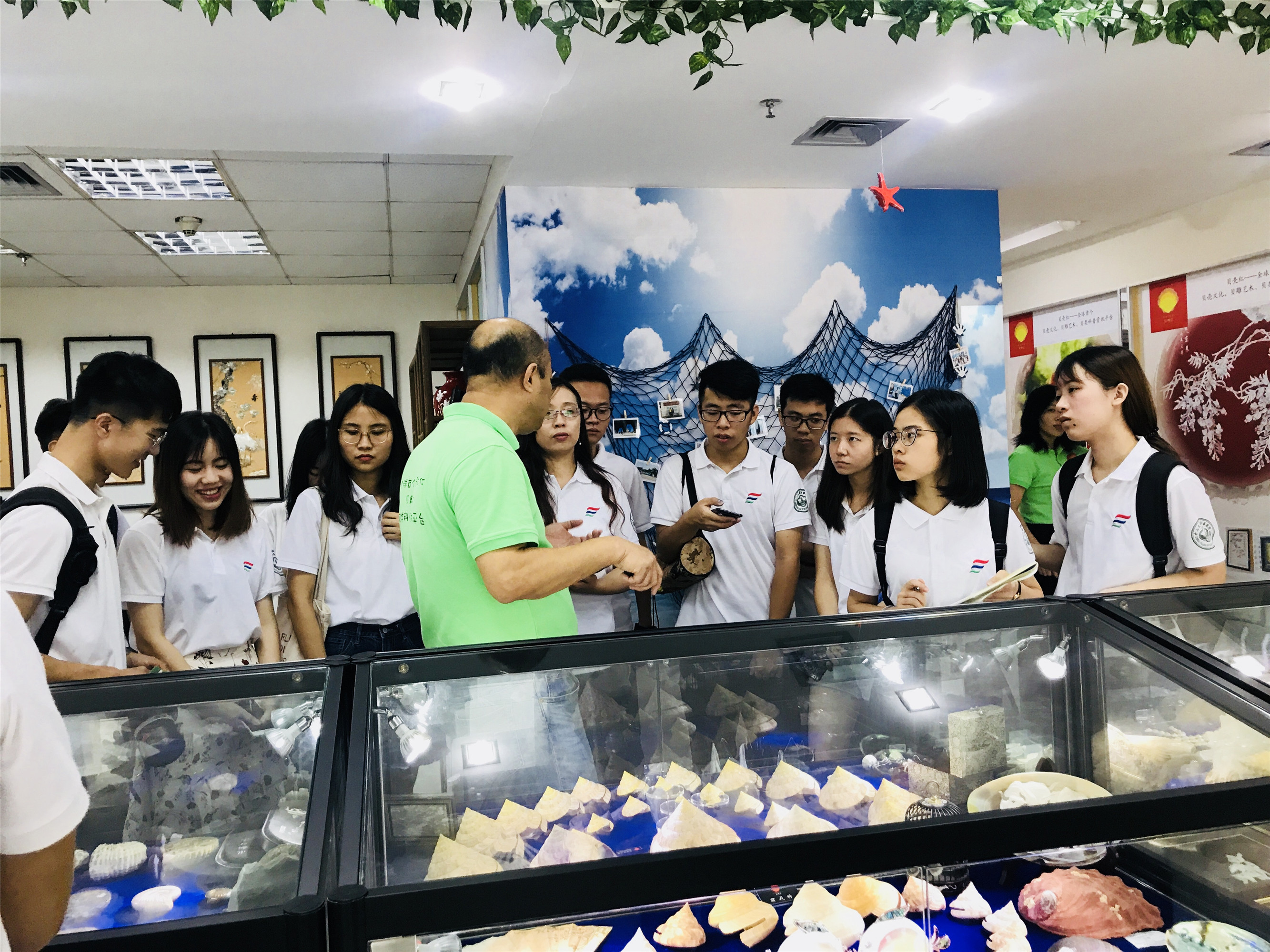 社會實踐隊的同學們在展館內(nèi)大致瀏覽了一番,展柜里陳列的貝殼迅速吸引了大家的眼球,墻面上展示的滿滿貝雕畫也令其驚嘆……