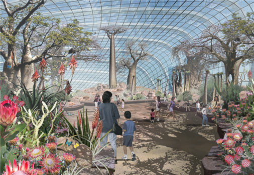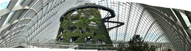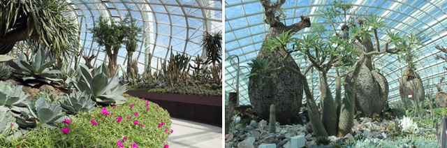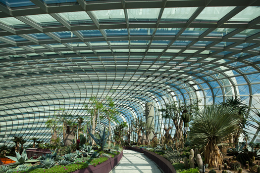 這兩座溫室就坐落在新加坡海灣花園一側(cè)。溫室里都有特別設(shè)計的生物環(huán)境,里面生長著瀕臨滅絕的植物和非新加坡本土植物。一個是陰涼干爽的環(huán)境,展示地中海植物的生物群落;一個是陰涼潮濕的環(huán)境,展示熱帶雨林植物的生物群落。