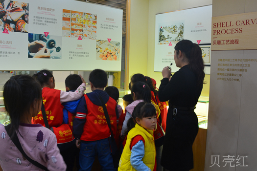 在貝雕流程展示區(qū),孩子們觀察著展柜里的設計稿、原料、機器、工具、半成品等,直觀地了解到貝雕工藝品的制作流程,了解每一件貝雕工藝品的來之不易。