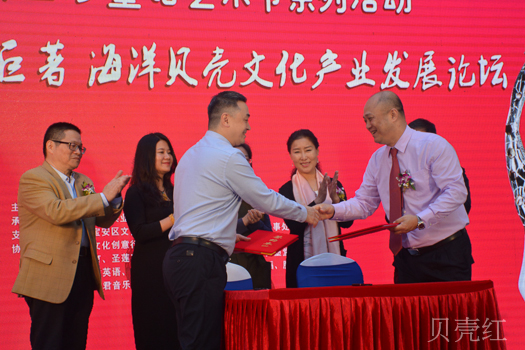 在這次海洋貝殼文化論壇中,由諸多領(lǐng)導(dǎo)共同見證,金沙童話總經(jīng)理朱大方先生與貝殼紅董事長陳新峰先生進(jìn)行了“海洋文化科普教育基地”的簽約儀式。