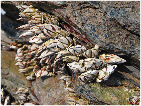 鵝頸藤壺一般一簇一簇群生群長,擠附在石頭縫中,長年不移動,靠吃水中的微生物生長。它的頭部呈長柄狀附著在基部底上的藤壺類甲殼動物,具白色鈣質(zhì)骨板,骨板開口邊緣為橙色。藤壺類的柄部已退化,頭狀部的殼板則增厚且愈合成“火山狀”。在頂部的“火山口”有4片由背板及盾板組成的活動殼板,由肌肉牽動開合,藤壺可由此伸出蔓腳捕食浮游動物的幼仔。