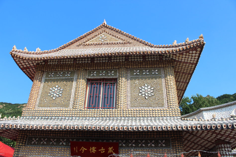 小樓外墻共1500平方米,全部用貝殼裝飾而成:北半邊為中國古代建筑風(fēng)格,以海螺殼為瓦片,以鮑魚殼為瓦當(dāng),用上百種貝殼粘成花鑲嵌,用彩貝和彩石構(gòu)成的漁家風(fēng)俗長卷作雕梁畫棟;南邊為海島風(fēng)情建筑,以藍與白為基色,用簡單的直線與弧線勾勒出建筑直白而又輝煌線條,暗合海天之色、自然造物;而中間以圓形小樓相連接,意喻靈山島的千年歷史文化與無數(shù)峻美景觀的和諧統(tǒng)一。