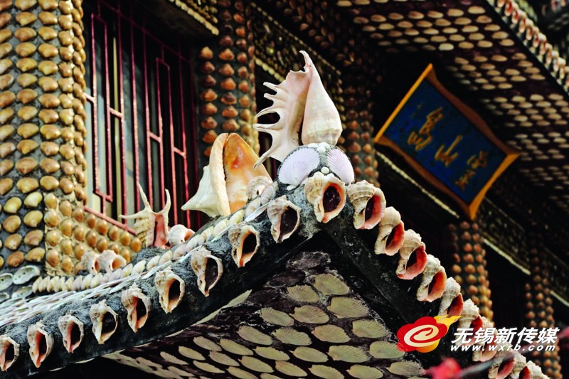 在大門的兩側(cè),則是由鮑魚殼等五六種貝殼裝飾而成,青色、白色交相輝映,再用紅色貝殼點綴,顯得繽紛多彩。顏色搭配和每種貝殼的用量以及大小,都要經(jīng)過嚴格計算,太密不好看,太稀不美觀。
