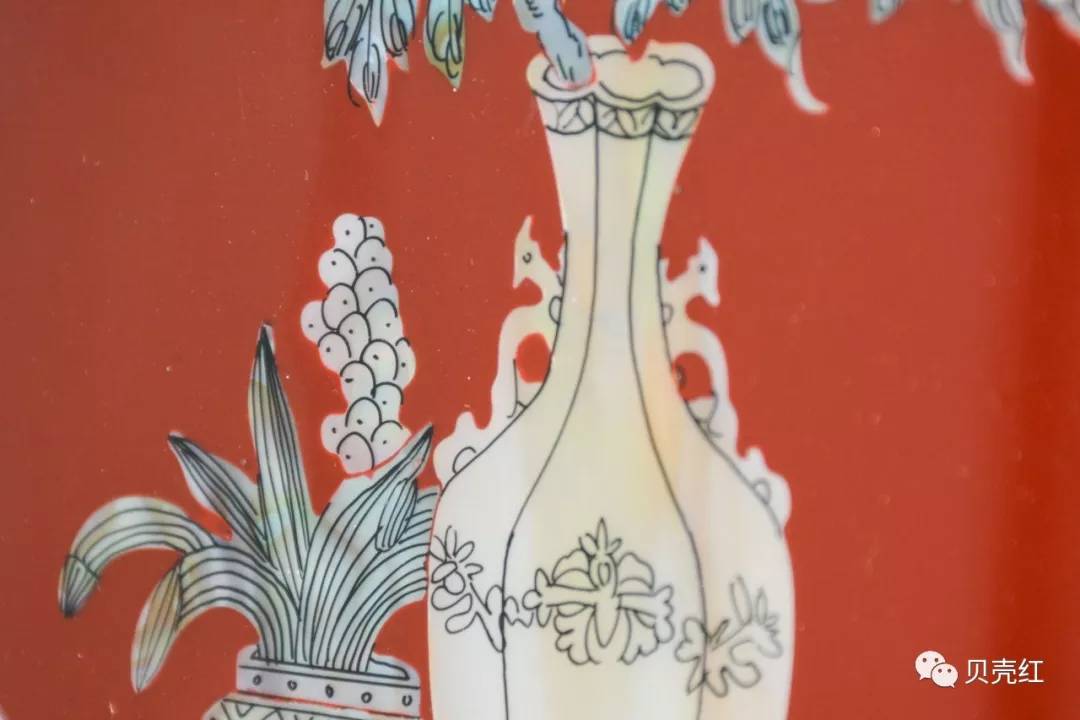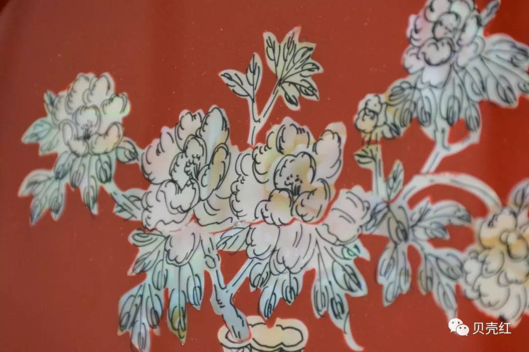 天然貝殼加工成的薄片潔白優(yōu)雅,折射著貝殼珍珠層獨(dú)有的虹彩光澤,組成牡丹花圖案的薄片還透著些許粉色,展示了花朵的嬌艷柔美,與萬年青、蘋果等相映成趣。