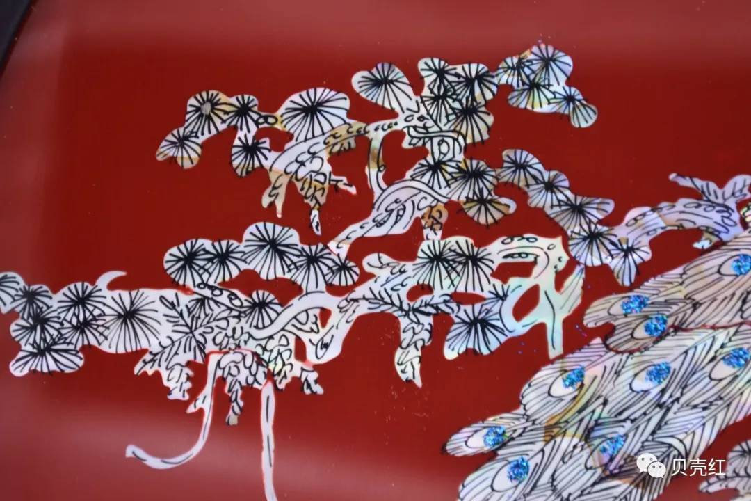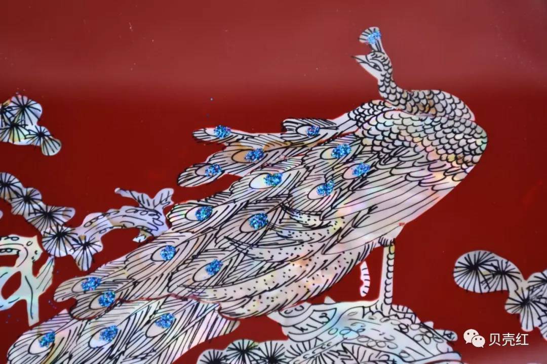 精挑細(xì)選色澤好的貝殼薄片拼貼成孔雀圖案,孔雀身上散發(fā)著七色虹彩光,雍容華貴;而松樹刻畫得十分曲折有致、蒼勁有力,整體構(gòu)圖精美和諧。