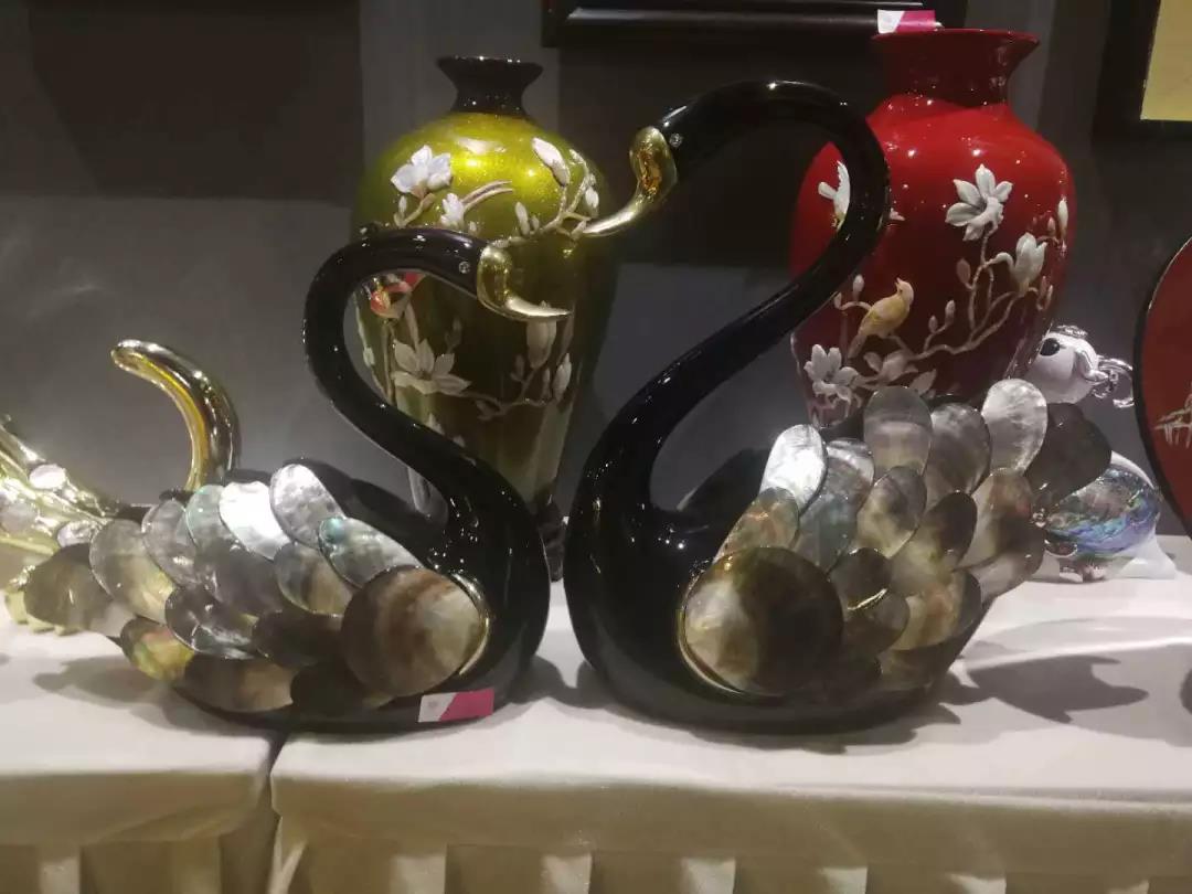 進入館內(nèi),映入眼前的是琳瑯滿目的貝雕飾品,有迎客松、天鵝、孔雀、花鳥等,惟妙惟肖,精美絕倫,你能想到下面這些惟妙惟肖的作品是用貝殼制作的嗎?