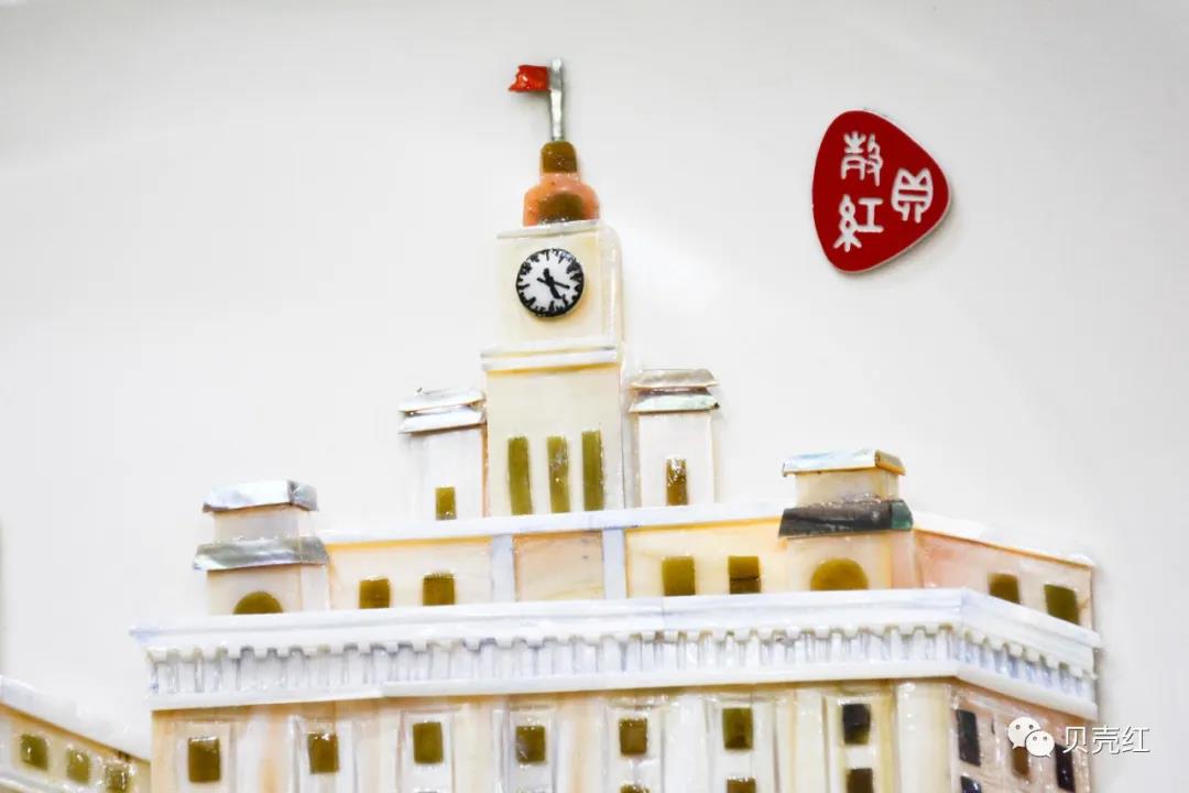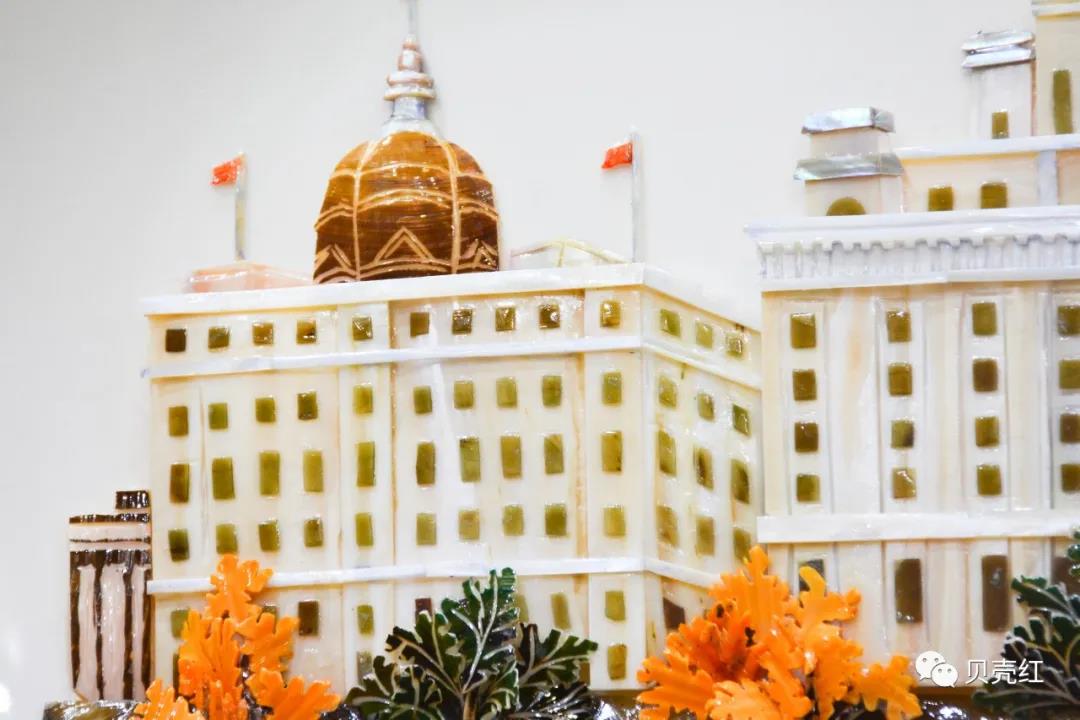 貝殼紅貝雕作品——《上海外灘萬國建》,以上海浦東發(fā)展銀行與海關(guān)大樓為主體,畫面整潔大氣;以珍珠貝的質(zhì)感,完美的刻畫出外灘建筑的古典,偏暖的色調(diào),仿佛連時(shí)光都變得溫柔。